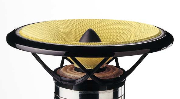 Głośnik średniotonowy to 150mm wyśmienity kewlarowy FST. Warto w tym miejscu pokrótce przypomnieć na czy polega, znana również z serii Nautilus, technologia Fixed Suspension Transducer. Jeżeli przyglądniemy się membranie głośnika FST, naszą uwagę zwróci brak zawieszenia membrany. Wygląda to tak, jakby membrana została przytwierdzona bezpośrednio do metalowej obręczy mocującej głośnik do obudowy kolumny. W rzeczywistości, między membraną a obręczą mocującą znajduje się wąski pierścień wykonany z polimerowej pianki. Podczas ruchu membrany, polimerowy pierścień nie tyle porusza się w przód i tył, co kurczy się i rozciąga. Co dzięki temu zyskujemy? Będący źródłem zniekształceń, generowany przez zewnętrzne zawieszenie dźwięk, został ograniczony do minimum. Udało się zredukować energię zwracaną od zawieszenia z powrotem do membrany. Polepszono odpowiedź głośnika na impuls, co zaowocowało lepszym odtwarzanie transjentów. Poszerzyło się również pasmo przenoszenia przetwornika w górnym zakresie częstotliwości. Niestety technologia FST ma również wadę - sprawdza się jedynie w przypadku niewielkiej amplitudy drgań, co ogranicza jej zastosowanie do głośników średniotonowych.